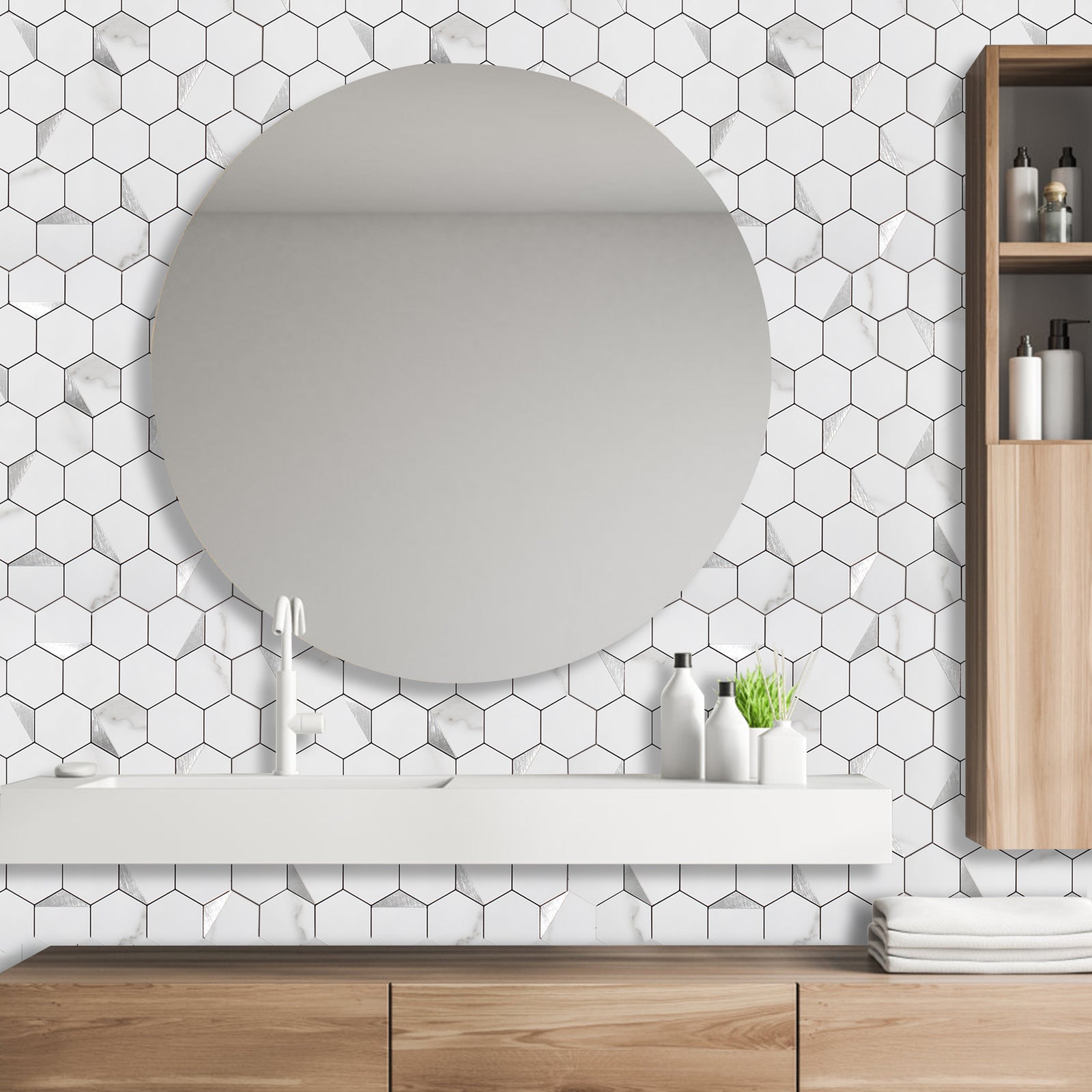 Our hexagon peel and stick tiles are widely used in kitchens, bathroom walls, living rooms, and more.