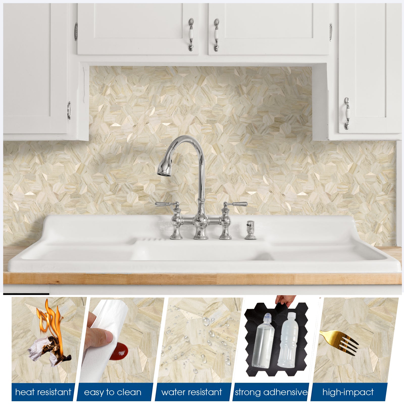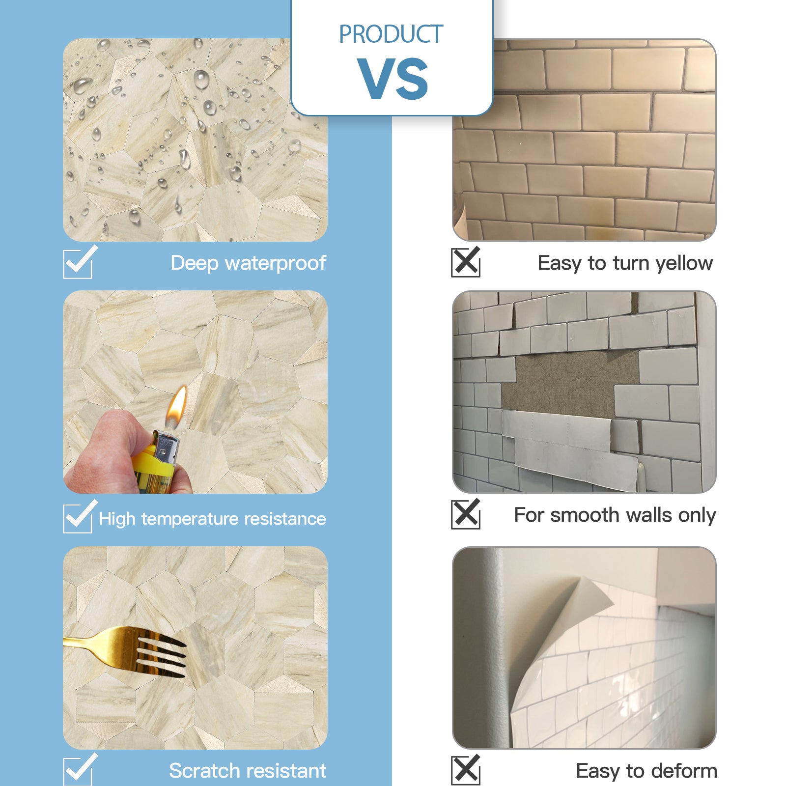 - √Waterproof and Heat Resistant: Keep your countertops and walls protected and looking great with these durable peel and stick tiles, resistant to heat and moisture. Perfect for behind stoves, sinks, and showers.