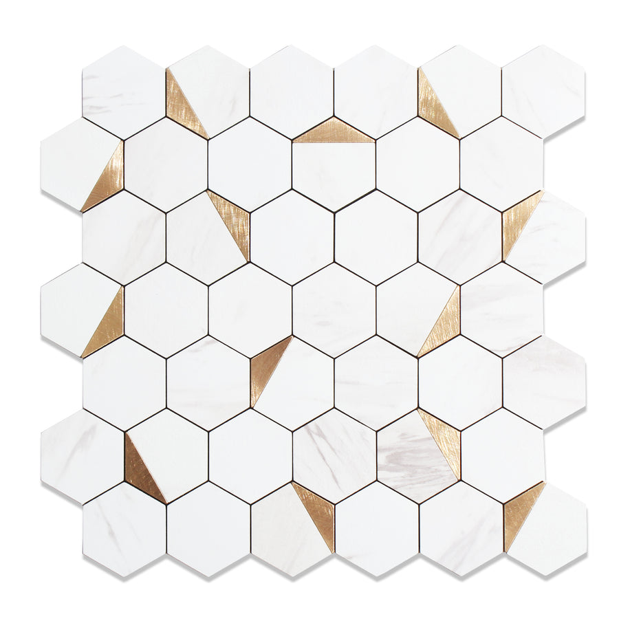 Sechseckige 3D-PVC-Wandfliese zum Abziehen und Aufkleben, Steinstruktur, gemischte Metalle