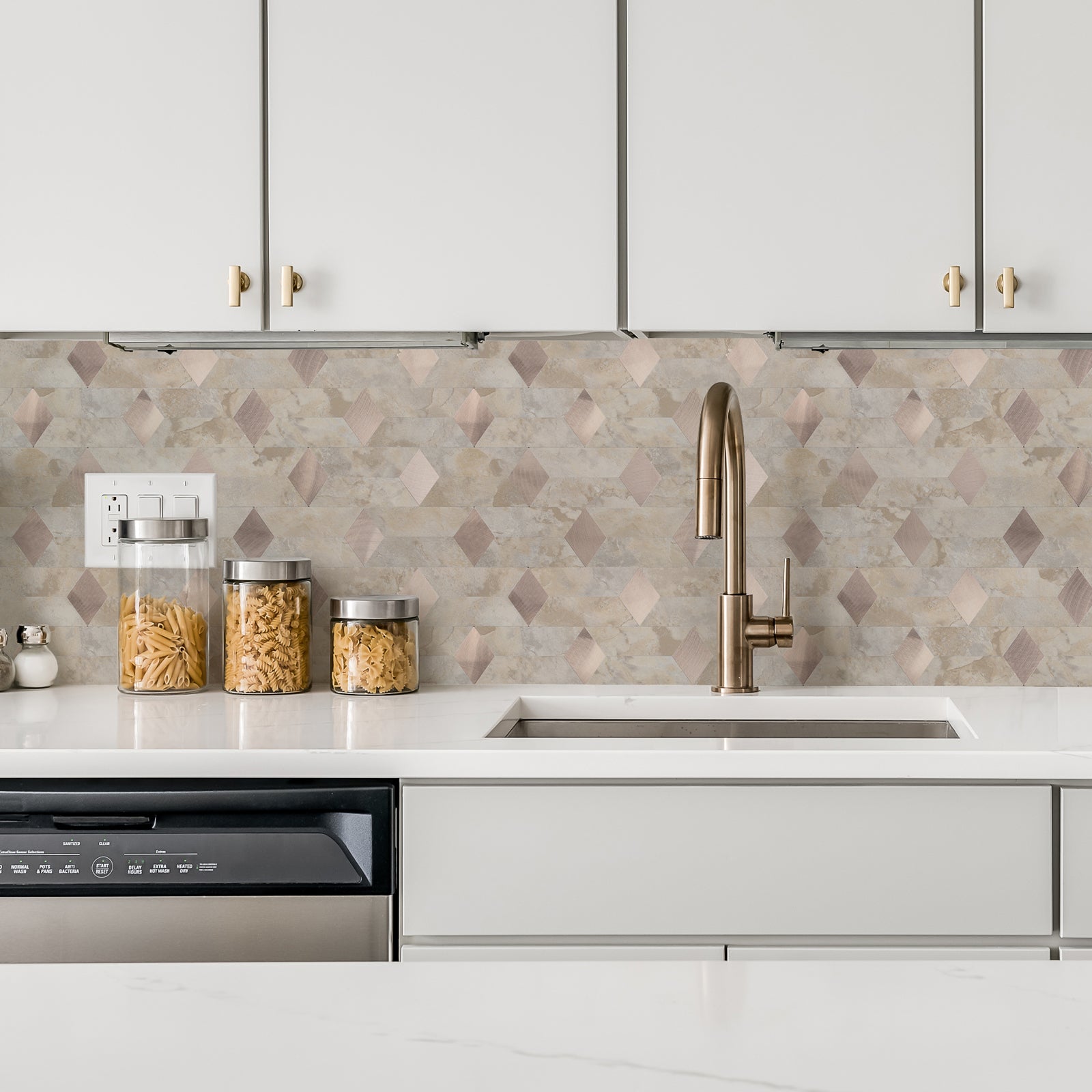 Peel, stick, and transform your space instantly. No mess, no tools, no fuss—just beautiful beige stone and metal tiles ready to go.